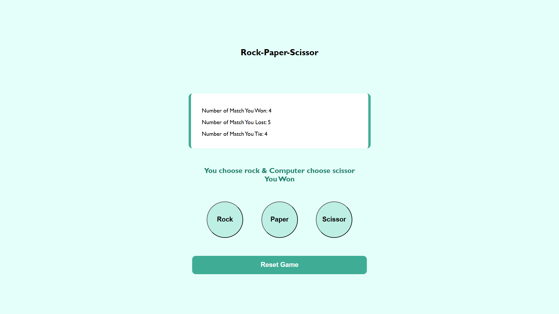 I built a Rock-Paper-Scissors game using HTML, CSS, and JavaScript. The project features a clean, responsive design and interactive gameplay. Players can select their move and see the computer's choice, with results displayed instantly. This game demonstrates my skills in front-end development, including DOM manipulation, event handling, and responsive design.